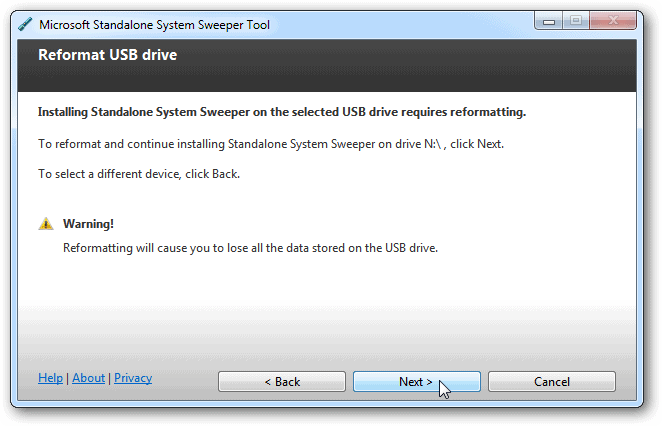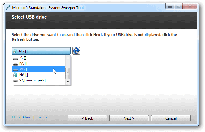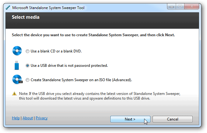 5. Now select the device you want to use to create the Standalone System Sweeper and click Next. Most modern PCs have the ability to boot from a flash drive, so you can select that option if you want.